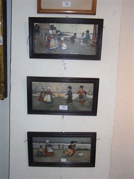 A set of three coloured lithographic prints of Dutch children by a harbour,