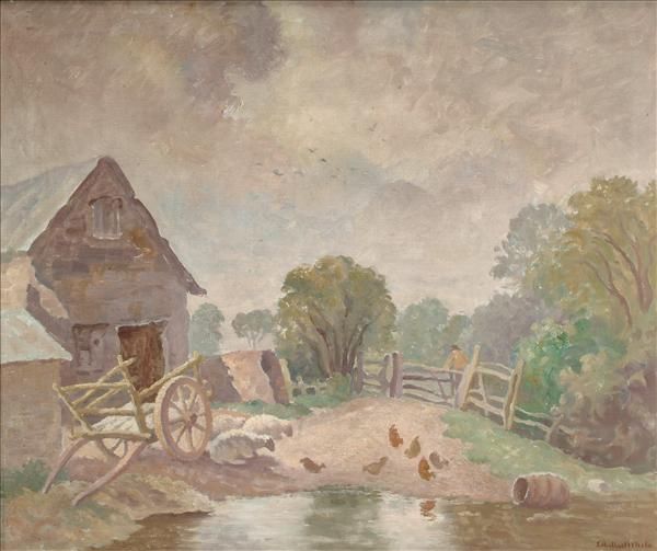 The Farm Pond, with poultry and sheep, a figure at the gate