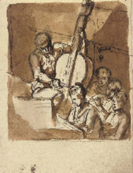 | Musicians playing the double bass, flute and keyboard, and singing | |
