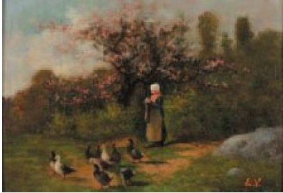 La gardienne d'oie sous les pommiers en fleurs