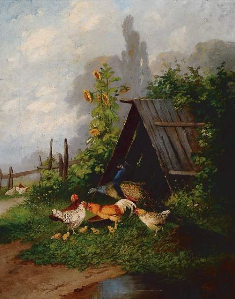 Ühnerhof mit Pfau und Sonnenblumen