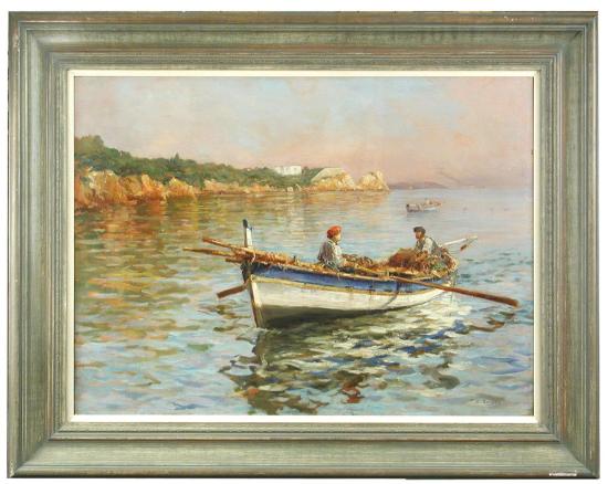 | Neapolitan fisherman at dawn in the Mediterranean in a blue, yellow and white painted rowing boat | |
