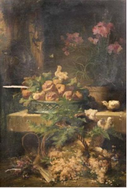 Nature morte à la corbeille de fruits et paniers de groseilles jaunes, animeé de poussin