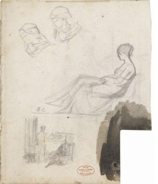 | Trois études : une femme de profil assise, deux femmes voilées et un intérieur ; plusieurs études au verso | |