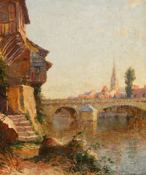 Stadt mit steinerner Bogenbrücke und Kirche
