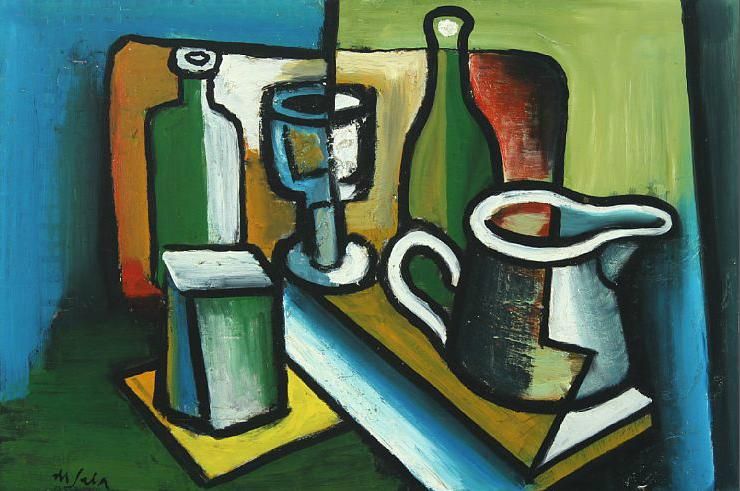Still life with bottles, glass and a jar