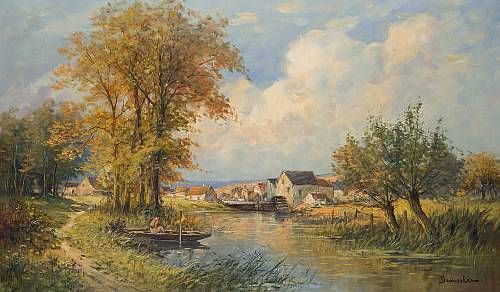 River landscape with watermill and figure in a punt