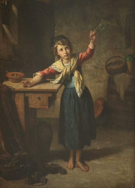 Kleines barfüßiges Mädchen mit dunkelblonden Locken beim Seifenblasen