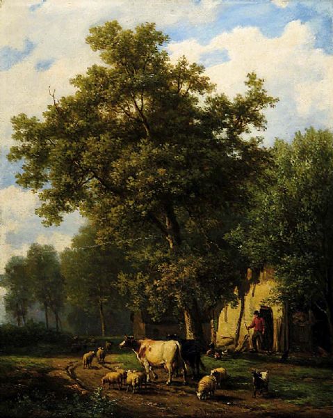 | Gemeinschaftswerk der beiden berühmten Maler, Darstellung: Bauernkate mit Hirte u. seinen Tieren: im Vordergrund Schafe | |