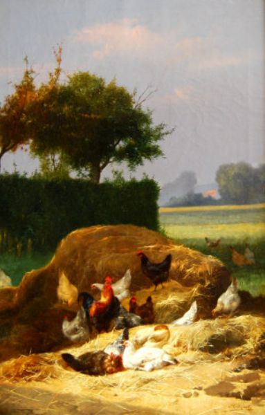 Chickens in a hay rick in summer and Chickens in a barn during winter