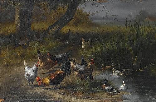 Poultry and ducks by a pond