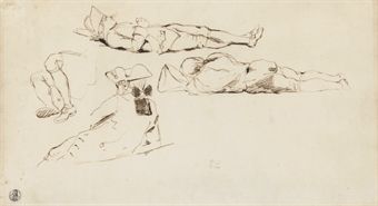 | Trois soldats allongés et coiffés de chapeaux à tricornes et une étude subsidiaire de jambes | |