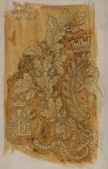 | Étude de blason au lion avec feuille de chêne et le chiffre « L » | |