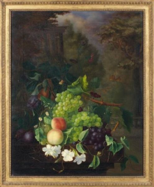 | Nature morte aux fruits, fleurs et papillons sur fond de colonnade | |