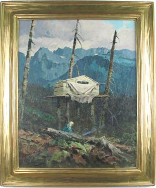 | An Alaskan landscape with raised food cache and woman in foreground | |