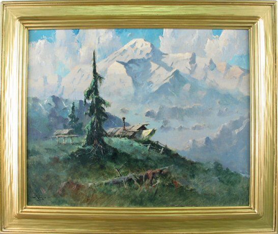 | My Studio, a mountain landscape with cabin, cache, Mt. Denali (McKinley) in the back ground | |