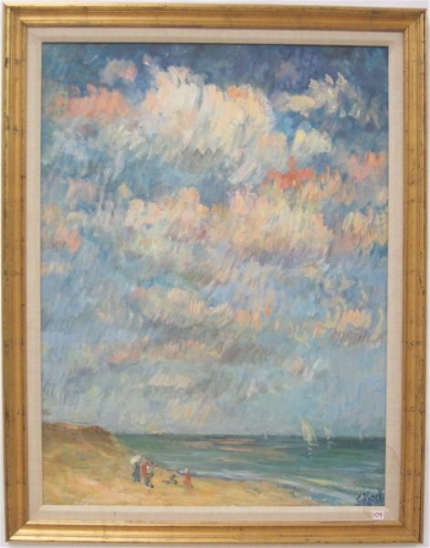 | An Impressionistic seascape with and expansive sky, figures walking on the beach and sailboats in the water | |
