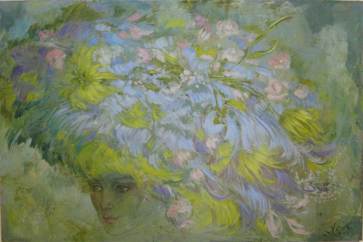 | Study of young woman wearing an enormous, colorful and outrageous floral hat | |