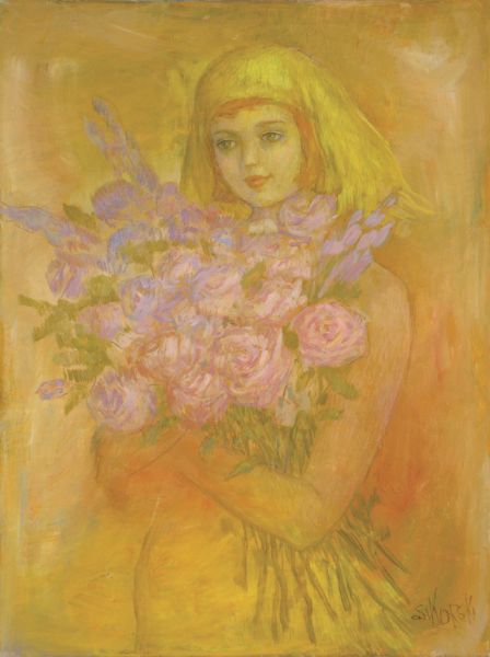 | Young woman with blonde hair with an arm load of long-stemmed pink roses | |