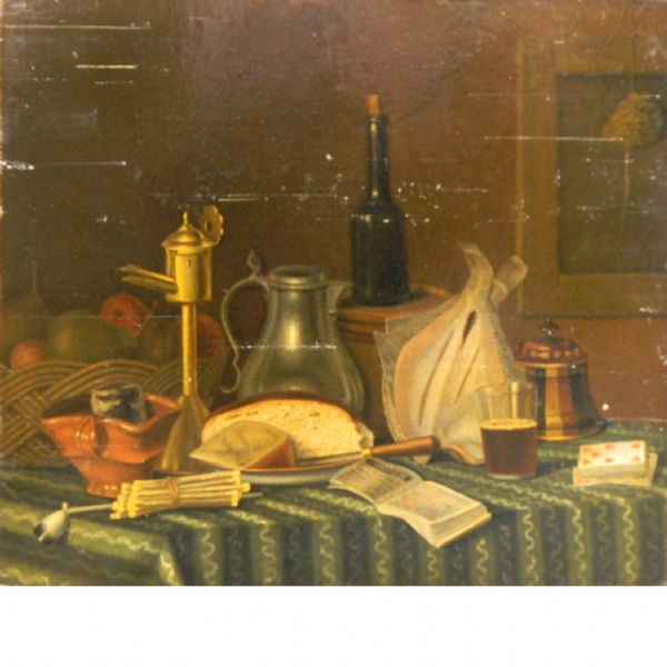 | Still Life with a Skate, Bread, Cheese, Clay Pipe, Playing Cards and other Objects on a Table | |
