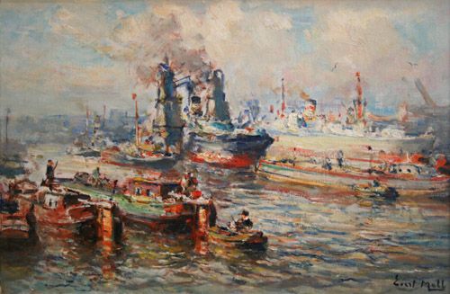 View of Barges, Boats and Ships in a Busy Harbour, probably Rotterdam