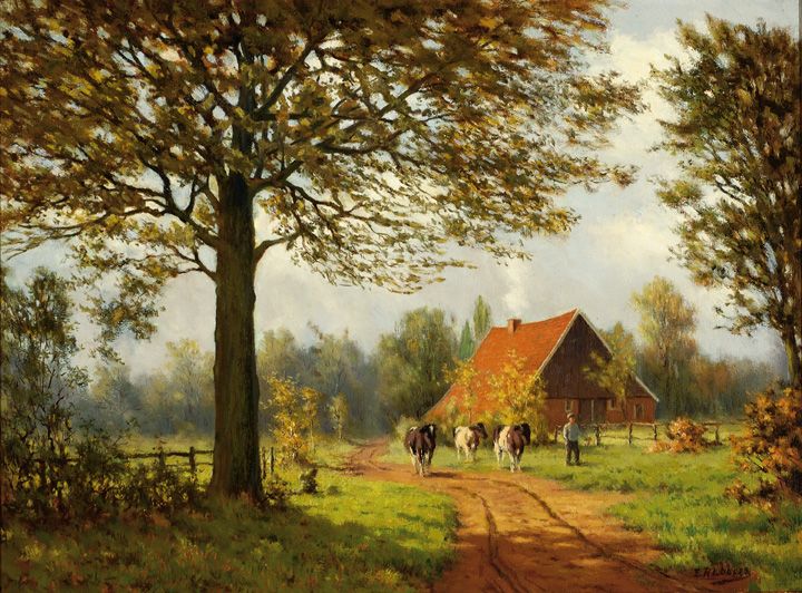 Three cows and a farmer on a sand road with a farm in the background