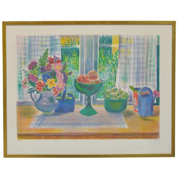 Stilleben med frukt, blommor och vattenkanna framför fönster