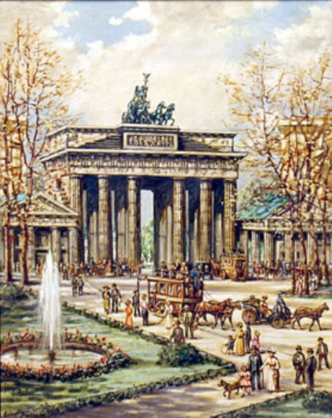 Reich belebte Ansicht des Brandenburger Tores mit Droschken und Spaziergängern