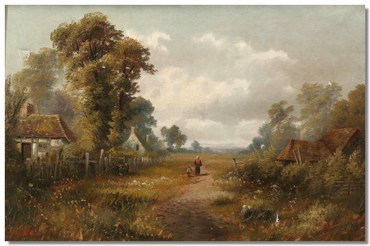 Rural landscape with figures on a path and cottages to each side