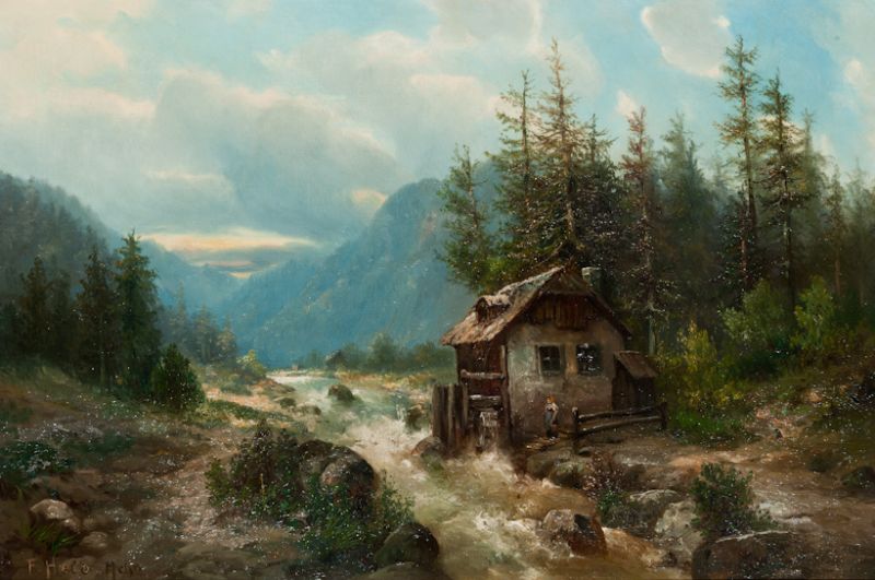 Wassermühle an sprudelndem Gießbach in Gebirgstal