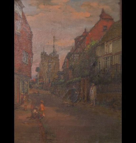 village street scene with figures and children playing