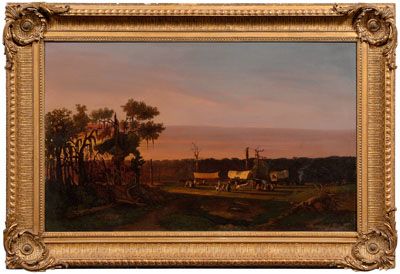 pioneers camping in a Southern landscape, trees with Spanish moss