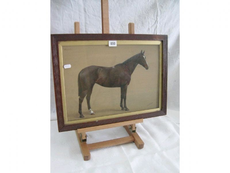 a standing Bay Horse with white flash and white sock