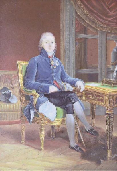 | The French statesman, Charles Maurice de Talleyrand-Perigold (1754-1838), seated at a gilt-metal mounted desk; interior backgrou | |