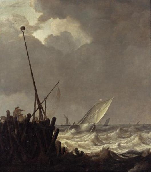 SHIPS IN STORMY SEAS WITH FISHERMEN STANDING AT A JETTY
