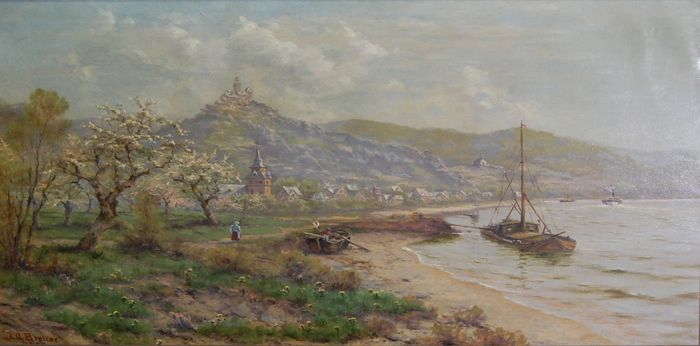 Paesaggio lacustre con imbarcazione e sfondo di paese