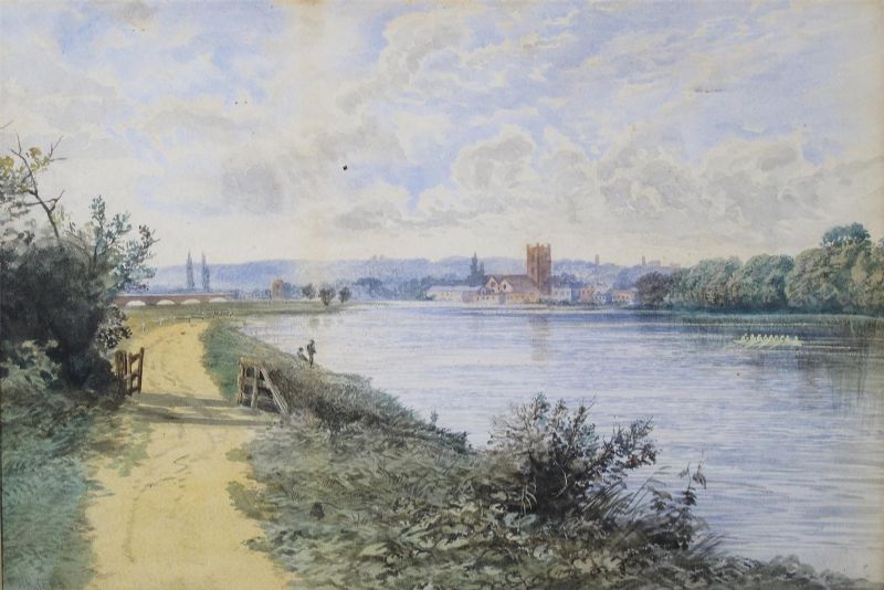 A river scene with a church and bridge beyond