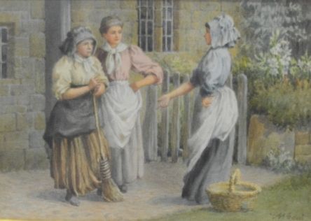 Three women in period dress in conversation before a stone cottage