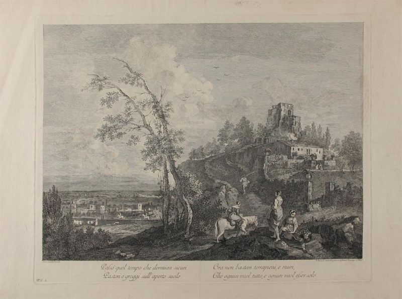 Italienische Landschaft mit Figurenstaffage vor Burghügel.