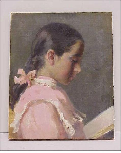 | portrait of a girl in a pink dress reading a book | |