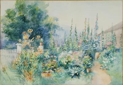 The Summer Garden, watercolor on paper, signed lower right and dated 1898, in gold stick frame with gold mat, under glass, OS: 23" x 29", SS: 14" x 20". Very faint foxing visible in sky. | |