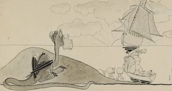 Dragon watching ship and sailors leaving