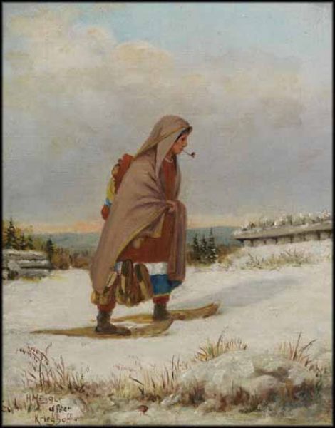 Indian Woman on Snowshoes with Pipe