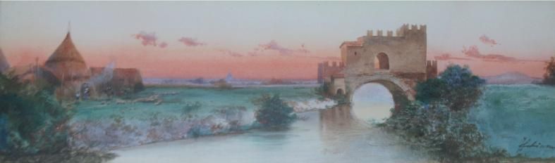 | NOMENTANO BRIDGE WITH ST PETER'S IN THE DISTANCE, SUNSET; A RUINED AQUEDUCT ON THE ROMAN CAMPAGNA | |