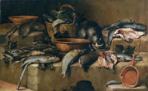 | A still life with fish, a wicker basket, vine leaves and a cat with its prey | |