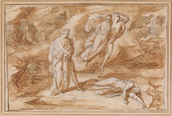 | Pencil and brush and reddish brown ink and wash on cream wove paper | |