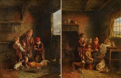 | Cottage interior with three boys; Stable interior with three boys, a cock bird and dogs - a pair | |