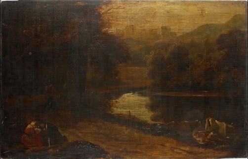 | Travellers resting by a path and cattle watering, in a wooded landscape, with a hill town beyond | |