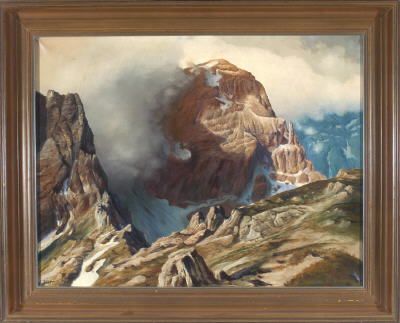 Blick auf einen wolkenverhangenen Hochgebirgsgipfel