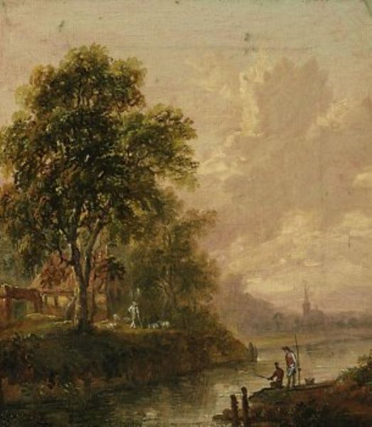Sommerliche Flußlandschaft mit Anglern und Schafthirt.